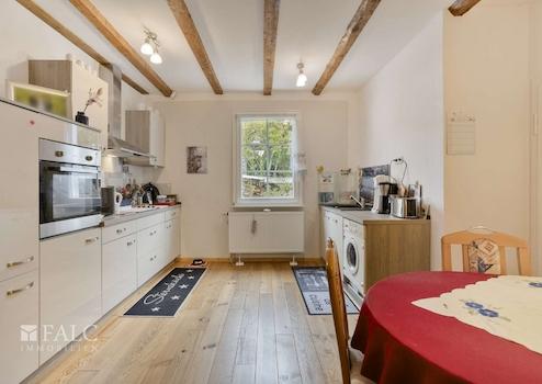 Die Wohnung im Anbau präsentiert sich als charmante Maisonette mit eigenem Zugang und rund ca. 75,50 m² Wohnfläche, verteilt auf Erd- und Dachgeschoss. Im Erdgeschoss entfaltet sich ein offener Grundriss mit Wohn- und Essbereich, angrenzender Küche und einem stilvollen Tageslichtbad mit Dusche. Hochwertige Echtholzdielen und sichtbare Fachwerkelemente schaffen ein warmes, authentisches Ambiente, das den Charakter des Hauses in zeitgemäßer Eleganz widerspiegelt. Im Dachgeschoss öffnet sich ein großzügiger Schlafbereich, der ausreichend Platz für ein komfortables Bett, Stauraum und bei Bedarf auch einen kleinen Arbeitsbereich bietet. Eine charmante Nische dient hier als separater Ankleidebereich und unterstreicht den wohnlichen Komfort dieser Etage. Die Maisonettewohnung ist derzeit vermietet.