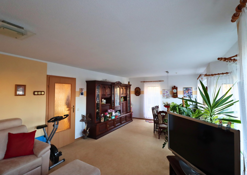Helles Wohnzimmer mit Zugang zur sonnigen Terrasse, große voll ausgestattete Küche, Gäste-WC mit Dusche, Hauswirtschaftsraum (HWR) sowie Flur.