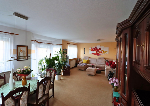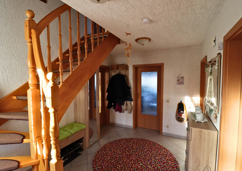 Bodenbeläge: Im Erdgeschoss überwiegend pflegeleichte Fliesen (Wohnzimmer mit textilem Fußbodenbelag); im Obergeschoss überwiegend textiler Bodenbelag, Bad mit modernen Fliesen