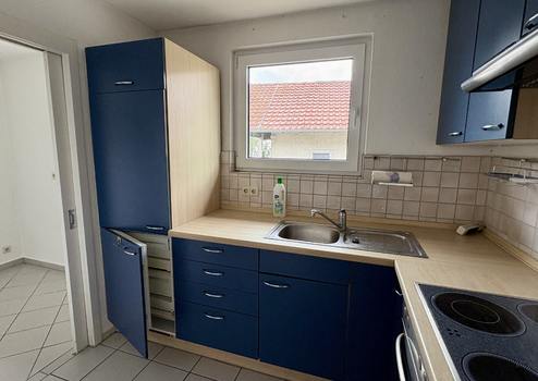 Im Obergeschoss befindet sich die zweite, ebenfalls gut geschnittene Wohnung. Sie bietet ein Schlafzimmer, ein Kinderzimmer, einen offenen Wohn- und Essbereich mit Zugang zur großen Dachterrasse, eine Küche mit Abstellraum, ein Tageslichtbad mit Badewanne und ein separates WC.