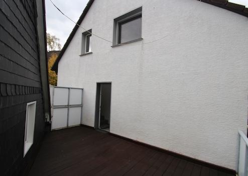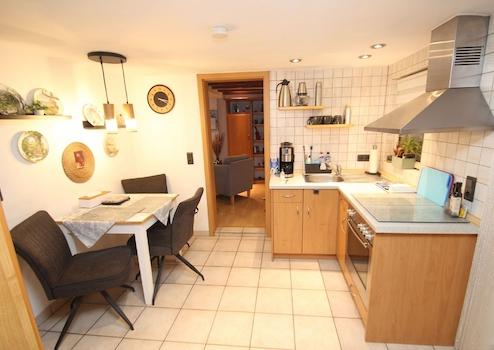 Das angrenzende Einfamilienhaus zeigt den besonderen Charme eines historischen Gebäudes. Die Kombination aus Fachwerk und Schiefer schafft ein unverwechselbares Ambiente. Auch hier wurden in den letzten Jahren wichtige Modernisierungen durchgeführt – darunter neue Fenster, ein zeitgemäßes Heizsystem sowie modernisierte Bäder. Dach und Dachstuhl wurden bereits erneuert.