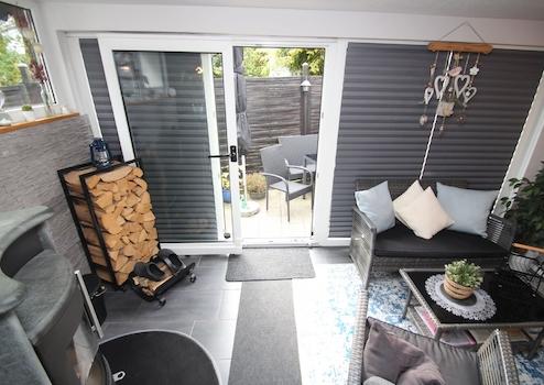 -Flur, Küche: Einbauküche (VHB), Schlafen, Wannenbad mit Fenster, kl. Abstellraum, Wohnen, kleiner Wintergarten und Terrasse