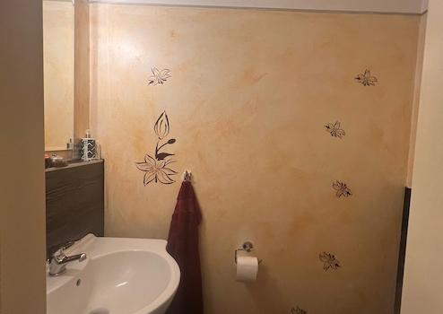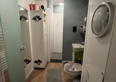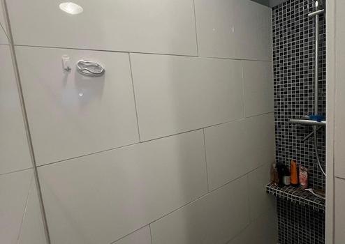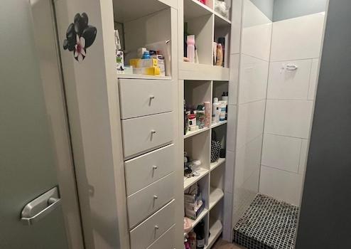 Modernisiertes Duschbad mit elektrisch ausfahrbarem Regal