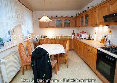 Über den überdachten Hauseingangsbereich gelangen Sie in den Flur, der Platz für eine Garderobe bietet. Eine Glasschiebetür verbindet den Flur mit dem Wohnzimmer. Das Wohnzimmer bietet einen Zugang in eine Einbauküche, die mit allen wichtigen Geräten ausgestattet ist – darunter ein Gasherd, Backofen, Umlufthaube, Geschirrspüler sowie ein Kühl- und Gefrierschrank. Die Küche bietet zudem genügend Platz für einen Essbereich, der zum gemeinsamen Frühstück oder Abendessen im Familienkreis einlädt. Die Fenster verfügen teilweise über mechanische Außenrollläden.