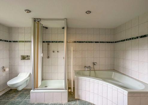 Das große Badezimmer verfügt über ein Fenster, ist raumhoch gefliest und mit einem Fliesenboden ausgestattet. Eckbadewanne, Dusche, Waschbecken, WC sowie Waschmaschinenanschluss sind vorhanden.