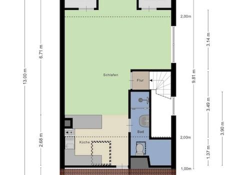 Das Dachgeschoss bietet vielfältige Nutzungsmöglichkeiten: Ein großer, offen gestalteter Raum eignet sich hervorragend als kombinierter Wohn- und Schlafbereich. Ergänzt wird diese Ebene durch zwei praktische Abstellkammern mit viel Stauraum, eine offene Küche sowie ein eigenes Badezimmer mit Dusche – ideal z. B. als Gästebereich, Jugendzimmer oder Arbeitsbereich.
