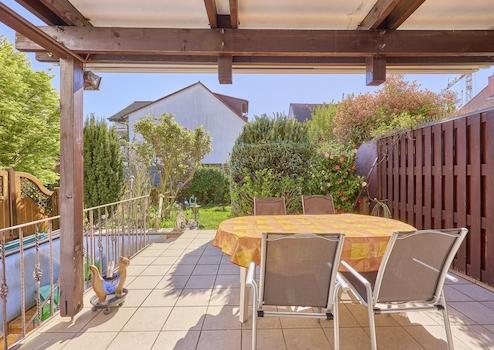 Balkon, Terrasse, Garten, Keller, Duschbad, Einbauküche, Gäste-WC, Laminat, Fliesen