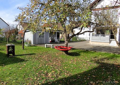 Hier genießen Kinder unbeschwerte Stunden im Garten, während Ruhesuchende in der Sonne entspannen oder ihrer Leidenschaft fürs Gärtnern nachgehen. Die weitläufige Gartenfläche mit Gartenhäuschen lädt zum Verweilen und Träumen ein.