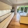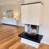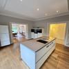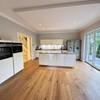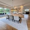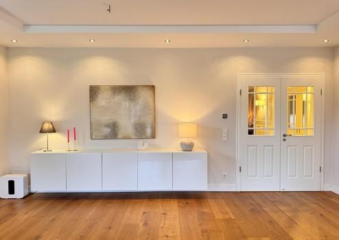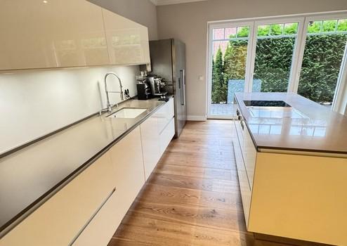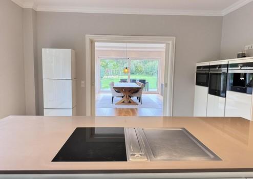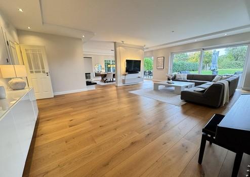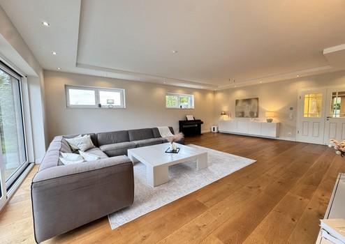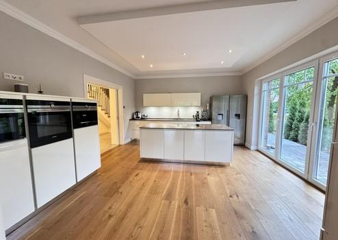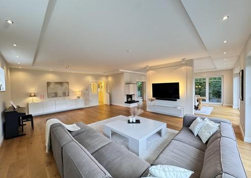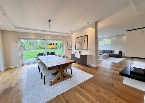 Vom Flur gelangt man sowohl in die sehr große, offene Küche als auch in den weiten Wohn- und Essbereich mit Kamin. Zwei übergroße Schiebeelemente zum Garten sowie zwei zusätzliche Doppel-Terrassentüren sorgen für beeindruckende Helligkeit und fließende Übergänge nach draußen.