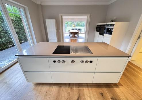 Herzstück des Hauses ist die hochwertige Einbauküche (u. a. Siemens). Langlebige Materialien treffen auf smarte Technik: Das BORA-Kochfeld mit integriertem Abzug zieht Dämpfe dort ab, wo sie entstehen – ohne Haube im Sichtfeld, mit freiem Blick in Wohn-/Essbereich und Garten. Für kulinarische Abende steht ein Teppanyaki-Grill bereit. Der Double-Door-Kühlschrank bietet großzügigen Stauraum; Eiswürfel und Crushed Ice gibt es auf Knopfdruck – perfekt für Gäste und Sommerdrinks.