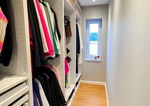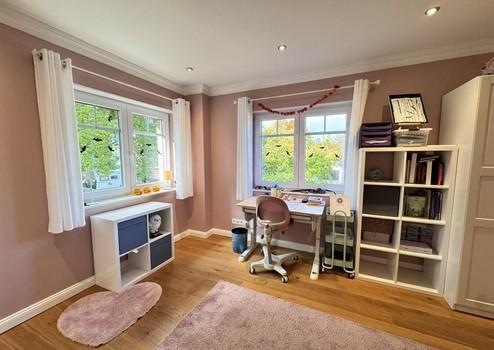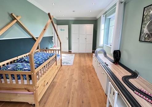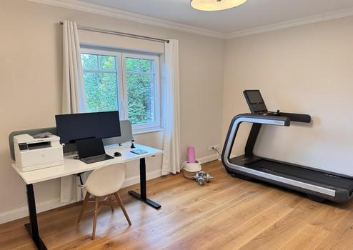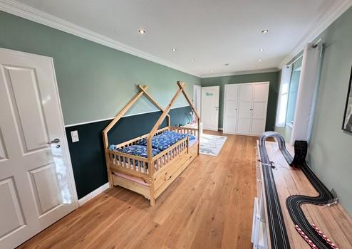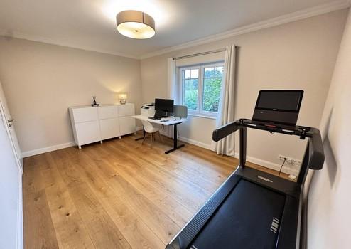 Im Erdgeschoss runden Hauswirtschaftsraum und Gäste-WC sowie ein großzügiges Arbeits-/Gäste- oder Sportzimmer (ideal als Home-Gym plus Home-Office) das Raumangebot ab. Die Deckenhöhe von 2,80m unterstreicht das luftige Wohngefühl. Im Obergeschoss befinden sich zwei sehr großzügige Kinderzimmer mit gemeinsamem Duschbad (jeweils en suite zugänglich) sowie die Master-Suite: ein helles Schlafzimmer mit Zugang zur Dachterrasse, ein effizient ausgebautes Ankleidezimmer und ein Vollbad en suite.