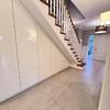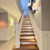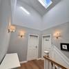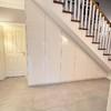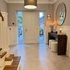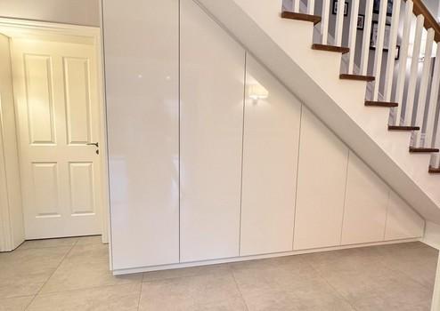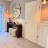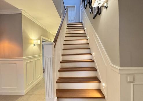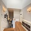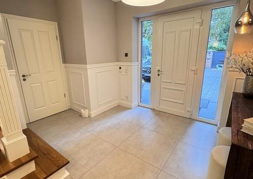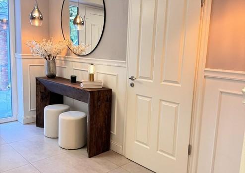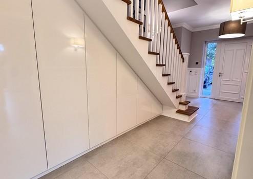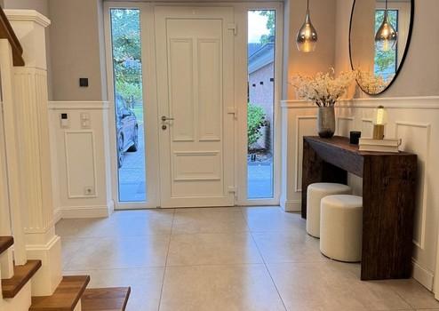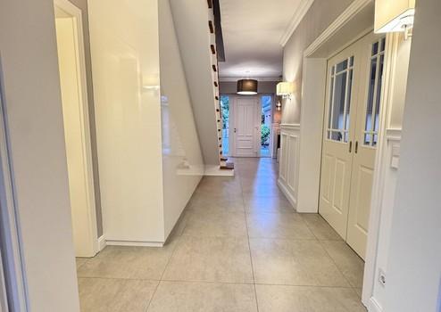 Der einladende, helle Eingangsbereich wird durch die verglasten Elemente der Haustür betont und führt in einen großzügigen Flur mit einer maßgefertigten Garderobenschrank-Kombination unter der Treppe. Bereits beim Eintreten fällt der Treppenaufgang mit eleganter Eichentreppe und Stuckleisten im amerikanischen Stil ins Auge.