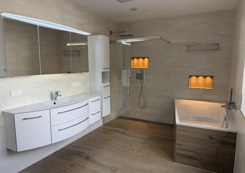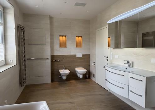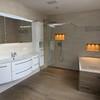 Das Hauptbad mit Tageslicht verfügt über eine große ebenerdige Dusche, eine Wanne, einem Doppelwaschbecken, WC sowie Bidet. Das Gästebad verfügt ebenfalls über Tageslicht.