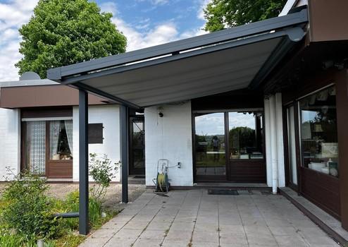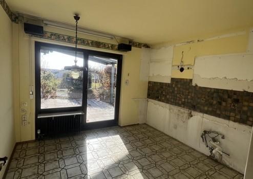 Die Küche grenzt an den großzügigen Wohn- und Essbereich mit Karmin, der den direkten Zugang zur Terrasse mit Überdachung und elektrischem Sonnenschutzrollo ermöglicht.