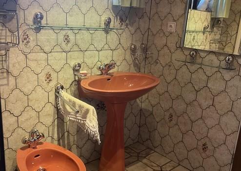Waschbecken und WC. Hinter einer Abtrennung befindet sich der Waschmaschinen-Anschluss und die Heizungsanlage.