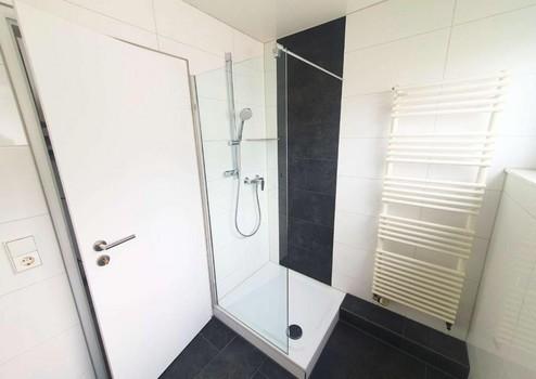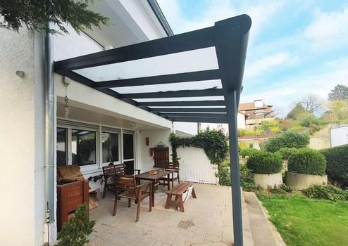Das Erdgeschoss verfügt über einen Eingangsbereich, ein Gäste-WC, eine offene Küche mit Essbereich und ein Wohnzimmer mit Zugang zur Terrasse. Die Terrasse ist mit einer Bedachung (Alu-Glas-Konstruktion) und einer integrierten Beleuchtung versehen.