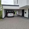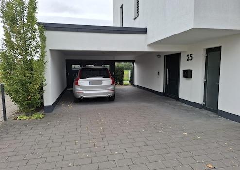 Die Wohnung erstreckt sich über die beiden oberen Geschossen eines Zweifamilienhauses, bei dem die Wohnungseingänge und sämtliche Versorgungssystemen vollständig getrennt ausgeführt wurden. Der zur Wohnung gehörige Carport ist ausreichend breit für zwei Fahrzeuge. Der Garten des Hauses gehört zur unteren Wohnung. Hinter dem Carport ist aber neben der Abstellfläche für Mülltonnen genügend Platz für einen Fahrradschuppen o.a.