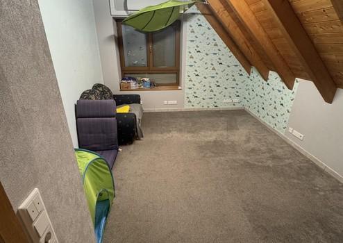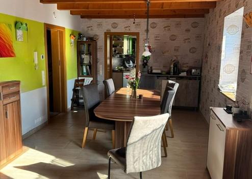 Zum Verkauf steht ein modern ausgestattetes, gepflegtes Einfamilienhaus mit separater Einliegerwohnung in Obervolkach. Das Gebäude aus dem Jahr 1997 ist solide gebaut: 50 cm starke Poroton-Außenwände, 25 cm Holzfaser-Aufdachdämmung und ein sichtbarer Dachstuhl aus gehobelten Balken. Die offene Holzbalkendecke im Erdgeschoss verstärkt den warmen, hochwertigen Charakter des Hauses.