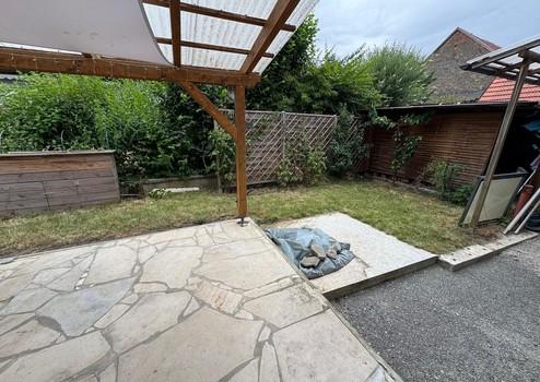 Draußen wartet eine große L-förmige Terrasse mit überdachtem Bereich, perfekt für Sommerabende. Ein großzügiges Doppelcarport mit elektrischem Rolltor (2024) und Beleuchtung bietet Platz für Fahrzeuge. Eine angrenzende Holzlege schafft zusätzlichen Stauraum.