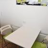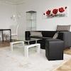 Wohnzimmer mit Sofa, Couchtisch, Lowboard mit TV, Esstisch mit 4 Stühlen, Schreibtisch, Zugang zum
