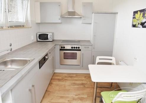 Neue Einbauküche, komplett ausgestattet mit Geschirrspüler, Mikrowelle, und Kühlschrank mit Gefrierfach.