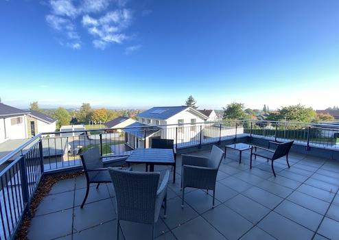 Genießen Sie den Ausblick über die Stadt von einer großzügigen Terrasse aus, die allen Mietern zur Verfügung steht. Machen Sie es sich in Ihrer Wohnung mit Einbauküche richtig gemütlich!