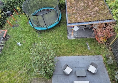 Im Garten befindet sich eine Gartenlaube mit Dachbegrünung - ideal für Kindergeburtstage.