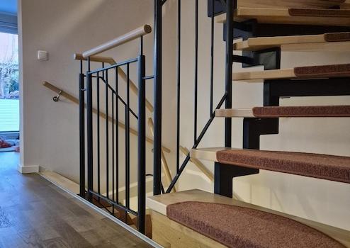 Es liegt direkt am Waldrand, zurückversetzt von der Straße, sodass kein direkter Auto-/Fußgängerverkehr am Haus vorbei führt.