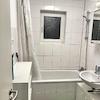 Das Badezimmer verfügt über eine Duschwanne und ein Fenster, das für angenehme Belüftung und Tageslicht sorgt.