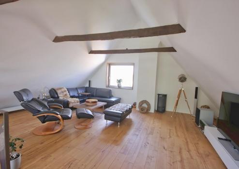 Durchdachte Fensterfronten und lichtdurchflutete Räume bieten Ihnen zu jeder Tageszeit eine helle und freundliche Umgebung. Der Einsatz von natürlichen Materialien wie altem Eichenholz, Stahl und Stein sorgt für eine wohltuende, angenehme Atmosphäre in jedem Raum.