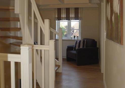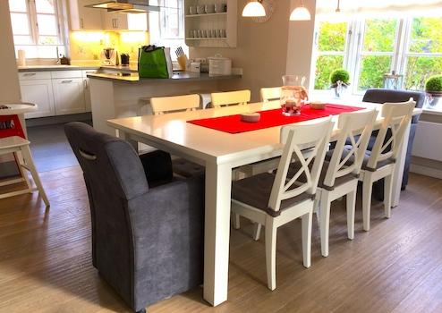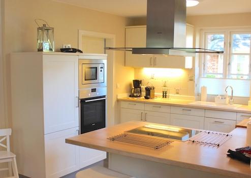 Das Haus ist hochwertig eingerichtet und komplett ausgestattet. Die Böden sind - bis auf die gefliesten Bäder und den gefliesten Küchenbereich - mit Eichenparkett ausgelegt. Die meisten Möbel sind individuell vom Inseltischler angefertigt und eingebaut. Geheizt wird hauptsächlich über ein Wärmepumpenanlage mit Energiegewinnung über die Außenluft.