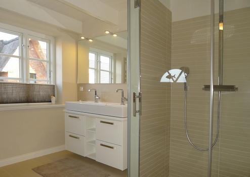 Im OG finden Sie 2 Schlafzimmer mit bequemen Boxspring-Doppelbetten und Einbauschränken. 1 Bad en Suite - mit Walk-in Dusche und Badewanne. 1 separates Bad - mit Doppelwaschtisch und Walk-in Dusche. Dazu eine Leseecke als zusätzliche Rückzugsmöglichkeit neben dem Treppenaufgang.