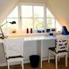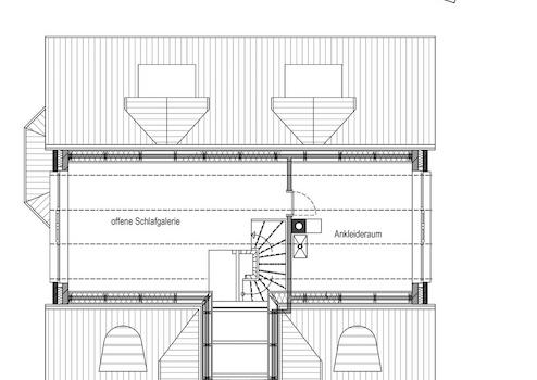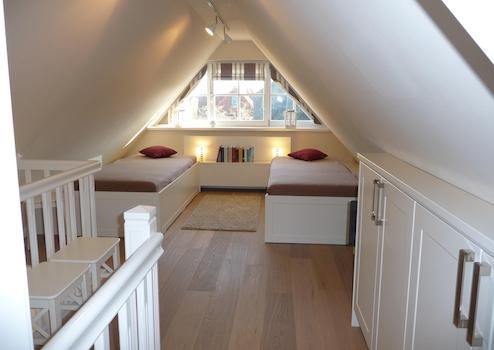 Die offenen Galerie im DG ist in zwei durch eine Tür getrennte Bereiche aufgeteilt. im vorderen Teil in einen Schlafbereich mit 2 Einzelbetten ausgestattet, im hinteren Teil in einen Arbeitsbereich mit einem großen Schreibtisch direkt vor dem Fenster.