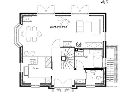 Im EG erwartet Sie ein offener Eingangsbereich sowie ein großzügiger Wohn- und Küchenbereich. Dazu noch gemütliches Gastzimmer mit einem Einzelbett - mit separatem Gäste-WC.