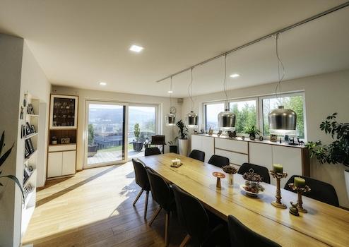 Großzügiger Wohn-/Essbereich mit Panoramaglas und steuerbarem Kachelofen, moderne Einbauküche, drei Zimmer, Gäste-WC. Repräsentativ – ohne laut zu sein.