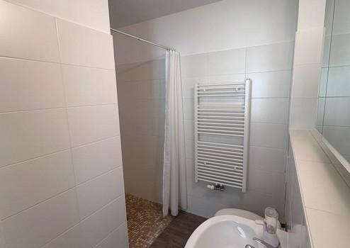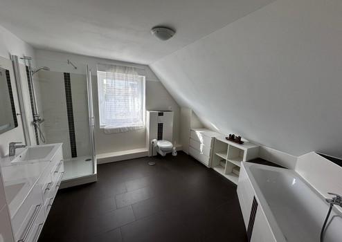 •Großzügiges Familienbad mit Doppelwaschbecken, Dusche und Badewanne sowie Badheizkörper für Handtücher