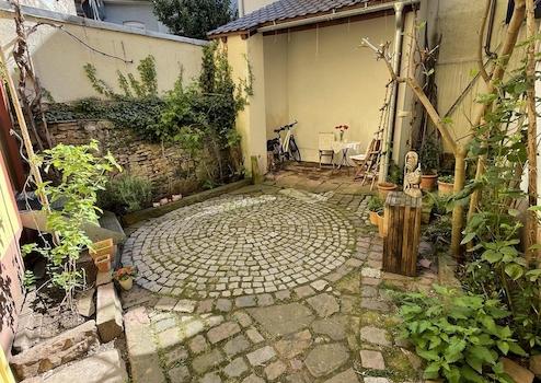 Das Hinterhaus wurde in den vergangenen Jahren immer wieder liebevoll renoviert und auch mit neuen Sanitärbereichen ausgestattet. Fast überall im Haus sind die originalen Holzböden und Holztreppen noch sehr gut erhalten, was dem Objekt einen sehr angenehmen und wohnlichen Charme verleiht. Im Erdgeschoss befindet sich ein Wohn-/Essbereich mit Zugang zur Innenhof-Terrasse, einem gefliesten Eingangsbereich mit Holztreppe sowie einem Gäste-WC. Das Obergeschoss bietet ein großzügiges Schlafzimmer mit französischem Balkon, ein Ankleidebereich mit Zugang zur Dacheinschnittterrasse sowie ein Duschbad. Im Dachgeschoss befindet sich noch ein Arbeits- bzw. Kinderzimmer mit einer Galerie, einem Dielenbereich sowie einem Tageslicht-Duschbad. Im schön erhaltenen Sandsteinkeller befindet sich die Gas-Brennwertheizung sowie ausreichend Platz für die Wein- und Getränkeeinlagerung. Ein Tiefgaragenstellplatz kann aktuell noch in der Nähe angemietet werden.