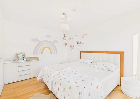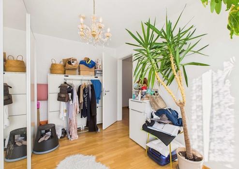 Bereits beim Eintreten empfängt Sie ein einladender Flur mit Platz für eine Garderobe; von hier erschließen sich alle Räume. Rechts neben der Eingangstür liegt das großzügige Tageslichtbad mit Dusche und Badewanne, direkt daneben ein weiteres Zimmer, derzeit als Ankleidezimmer genutzt, das sich ebenso gut als Kinderzimmer eignet. Entlang des Flurs folgen ein kompaktes Gäste-WC sowie ein weiteres, helles Zimmer, aktuell als Büro genutzt und dank großer Fensterfront besonders freundlich. Am Ende des Flurs öffnet sich das große Schlafzimmer mit zwei bodentiefen Fenstern, die sich zu einem französischen Balkon öffnen lassen.