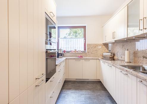 Abgerundet wird das positive Gesamtbild dieser Immobilie durch ein modernes Gäste-WC und zusätzliches Vollbad mit Fenster sowie der attraktiven Küche. Die luxuriöse Einbauküche verfügt über ansprechende Oberschränke und Unterschubladen im modernen, hellen Design und sämtliche Marken-Elektrogeräte wie Geschirrspüler, Wrasenabzug, E-Herd mit Cerankochfeld sowie Kühl- und Gefrierkombination.