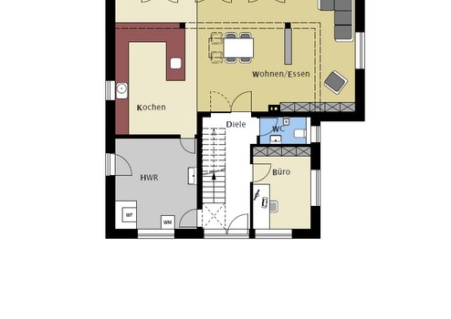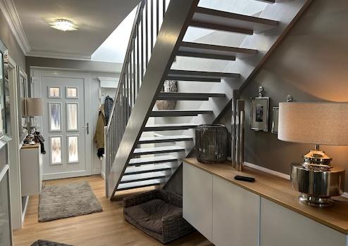Bereits beim Betreten des ca. 162 m² großen Hauses, vermittelt der imposante Wohn-Essbereich ein Gefühl von Wärme und Behaglichkeit. Der offen gestaltete Wohn- und Essbereich mit Kaminofen und direktem Zugang zur Terrasse besticht durch klare Linien, große Fensterfronten und eine weiße Design-Einbauküche, die keine Wünsche offenlässt. Auf dieser Wohnebene befinden sich noch ein Gäste-WC mit Tageslicht, ein HWR sowie ein Zimmer, welches derzeit als Büro genutzt wird.