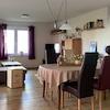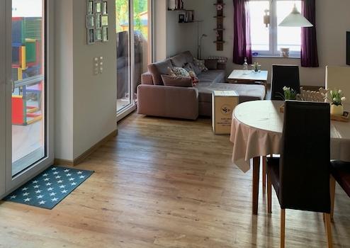 Vom einladenden Eingangsbereich öffnet sich das großzügige Wohn- und Esszimmer, das dank großer Fensterflächen viel Tageslicht erhält und einen direkten Zugang zum eigenen, liebevoll angelegten Garten bietet. Die überdachte Terrasse schafft zusätzlichen Raum zur Entspannung und macht den Außenbereich nahezu ganzjährig nutzbar. Die offene Küche befindet sich praktischerweise auf der rechten Seite des Wohnbereichs und fügt sich harmonisch in das Gesamtbild ein.