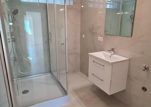 Stilvolles Badezimmer mit Dusche, Spiegel & Waschbeckenunterschrank