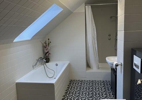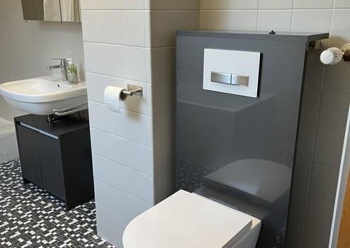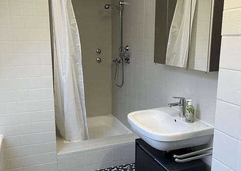 - Badezimmer: Das Badezimmer ist funktional ausgestattet und bietet eine Badewanne, eine separate Dusche sowie ein spülrandloses Wand-WC, das höchsten Komfort bietet.