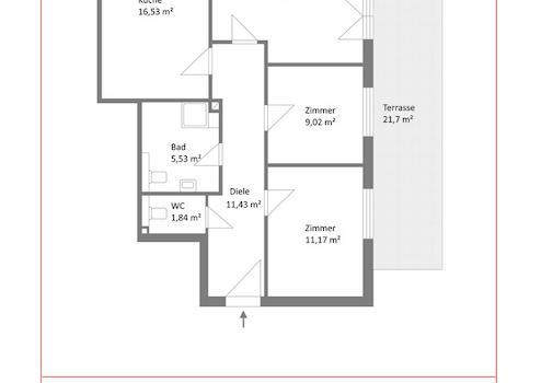 Schon der Eingang dieses Mehrfamilienhauses empfängt die Bewohner und Besucher mit einem hellen und freundlichen Ambiente. Hinter der Wohnungstür im Erdgeschoss lädt dann eine gut geschnittene 3 Zimmer-Wohnung zum Wohlfühlen und Verweilen ein. Von einem langen und breiten Flur gehen alle Räume ab, zur rechten Seite die beiden Schlafzimmer und das Wohnzimmer, zur linken dann Gäste-WC, Bad und die Küche. Versehen mit einer modernen Einbauküche und einer gemütlichen Essecke entwickelt dieser Raum besondere Anziehungskraft und macht einem das Aufstehen schwer, wenn man den leckeren Kuchen, die heiße Tasse Kaffee und den Nachbarschaftsplausch genossen hat. Vom Wohnzimmer, das durch isolierverglaste Fenster und Türen viel Licht von draußen hereinlässt, gelangt man auf die mehr als 20 qm große Terrasse, die im Sommer zu einem zweiten Wohnzimmer werden kann.