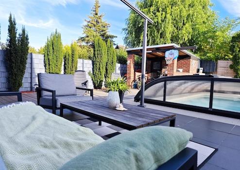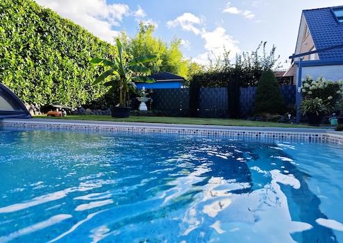 Terrasse, Garten, Vollbad, Duschbad, Pool · Schwimmbad, Einbauküche, Gäste-WC, Kamin, Fliesen