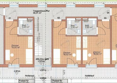 Folgende Zimmertypen herrschen im Neubau vor: 14 Ein-Zimmer-Apartments, eine Zwei-Zimmer-Wohnung und eine Drei-Zimmer-Wohnung. Diese verteilen sich auf Tiefparterre / Gartengeschoss, Erdgeschoss, Obergeschoss und Dachgeschoss. Die Einheiten sind sehr modern und praktisch eingerichtet. Ausstattungsmerkmale wie Fußbodenheizung, Lüftung, bodentiefe Duschen, hochwertige Sanitäreinrichtungen, Handtuchwärmer, elektrische Außenbeschattungen gehören zur Standardausstattung. Durch den Einbau von individuellen Anschlüssen und Verbrauchszählern ist jede Einheit einzeln abrechenbar, wie bei einer Eigentumswohnung.