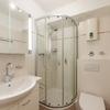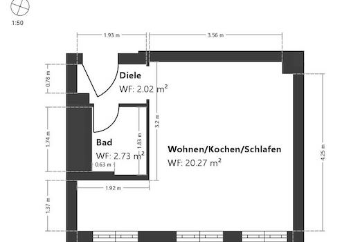 Durch die Haustür betreten Sie einen kleinen, einladenden Flur. Direkt neben dem Flur befindet sich das moderne Badezimmer, das mit einer Dusche, einem Waschbecken und einer Toilette ausgestattet ist. Die Küche bietet ausreichend Platz für Kochutensilien, Herd, Spüle und Stauraum. Das großzügige Zimmer ist lichtdurchflutet, sodass es eine angenehme Wohnatmosphäre schafft.