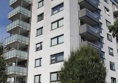 Das 7-stöckige Mehrfamilienhaus steht auf der Ecke Goethe-/Lindemannstraße. Vom Verkehr bekommt man im 6. Obergeschoss kaum etwas mit, hat dafür aber einen weiten Blick bis zum Grafenberger Wald oder bis zum Rheinturm.