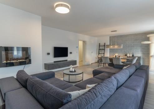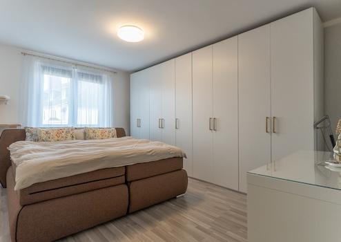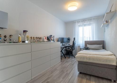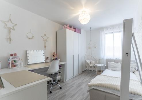Vom Eingang aus gesehen zur rechten Seite befinden sich zwei helle Kinderzimmer, ein weiteres Badezimmer mit Wanne und der gemütliche Wohnraum mit dem Ausgang zum zweiten Balkon.