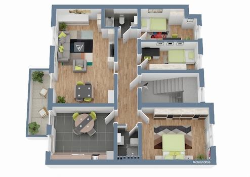 Bäder: Bad 1 mit Wanne, WC und Waschbecken, Bad 2 mit Dusche, WC und Waschbecken